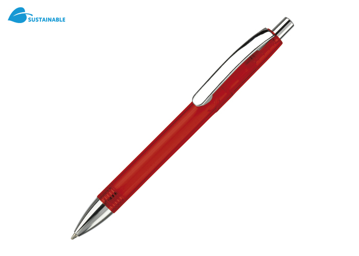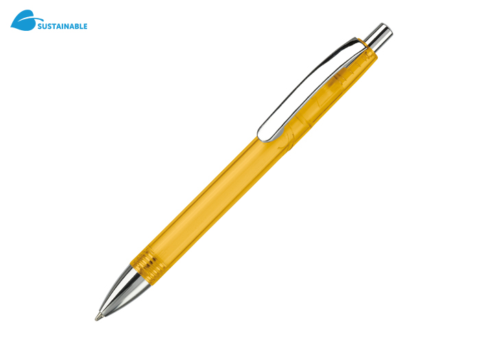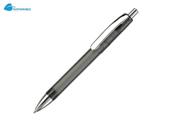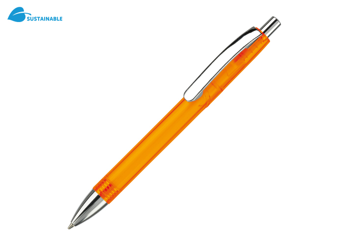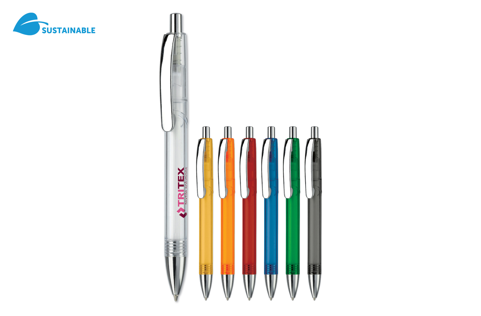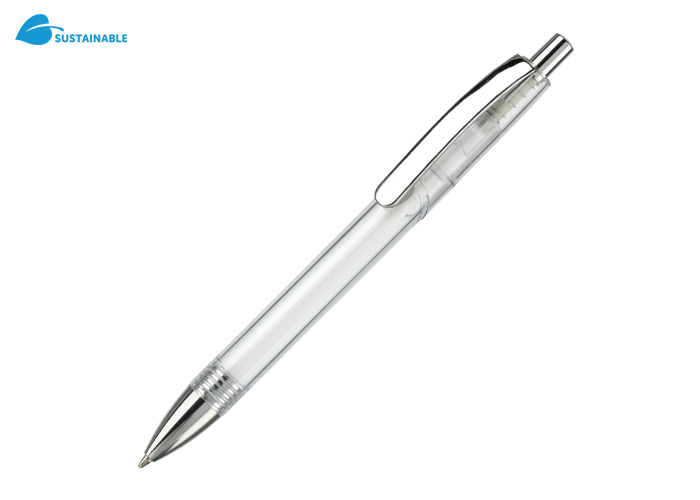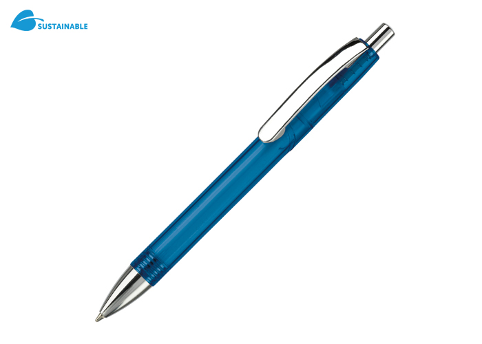 Kunststof transparante Toppoint design balpen met blauw schrijvende Jumbo vulling, metalen clip en gemetalliseerd onderstuk en drukker.