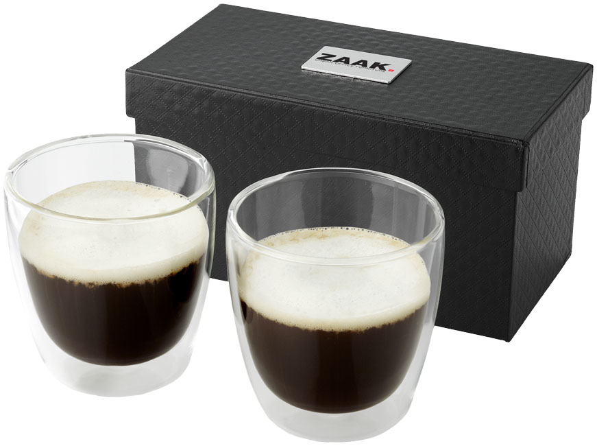 Boda 2-delige koffieset. Dubbelwandige koffiemokken van 200 ml. De set wordt geleverd in een luxe geschenkverpakking met logoplaatje. Glas.