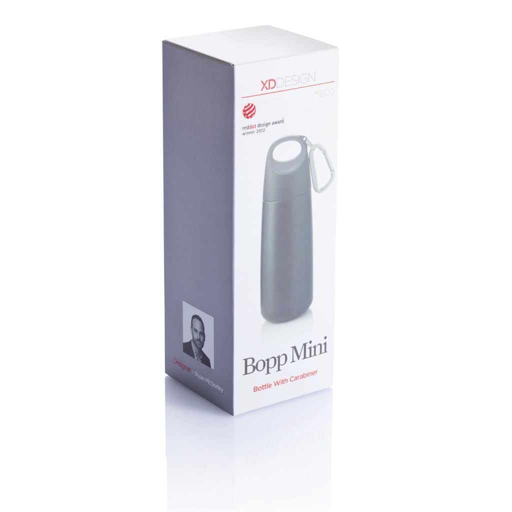 Bopp Mini is een compacte 350ml enkelwandige roestvrijstalen fles met matte finish, deksel in contrasterende kleuren en mat zilveren karabijnhaak, die het makkelijk maakt hem overal mee naar toe te nemen. Geregistreerd ontwerp®