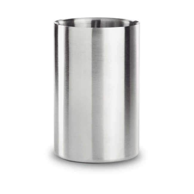 Dubbelwandige ronde flessenkoeler van roestvrijstaal.