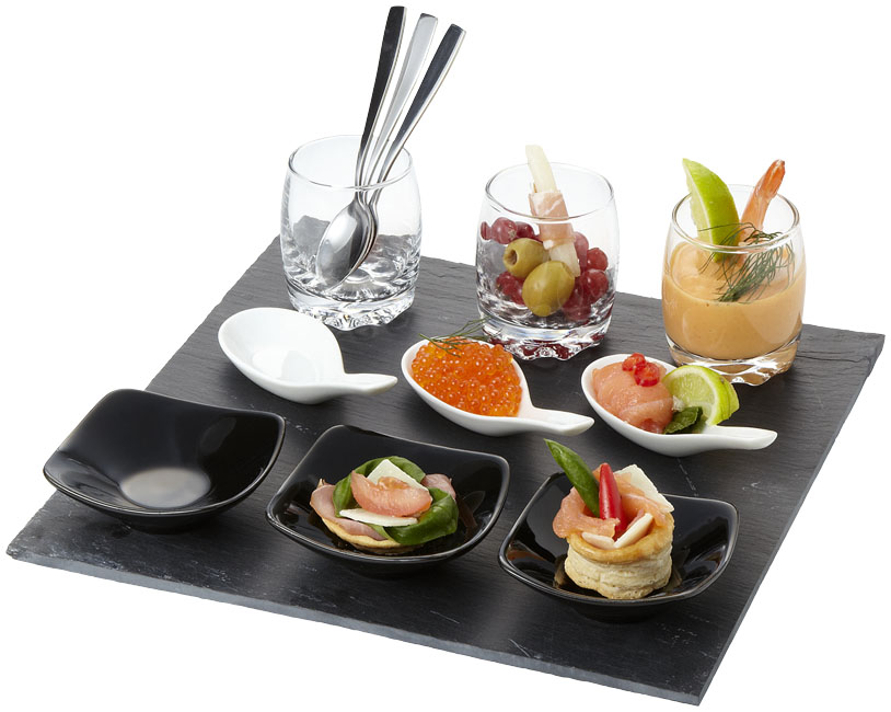 Culi 13-delige amuseset. Verras uw gasten met een minihapje voor het eten. Deze amuseset bestaat uit 3 glazen met metalen lepels, 3 aardewerk lepels en 3 aardewerk kommen, op een blad van leisteen. Geleverd in geschenkverpakking. Exclusief ontwerp. Leisteen, keramiek, glas en metaal.