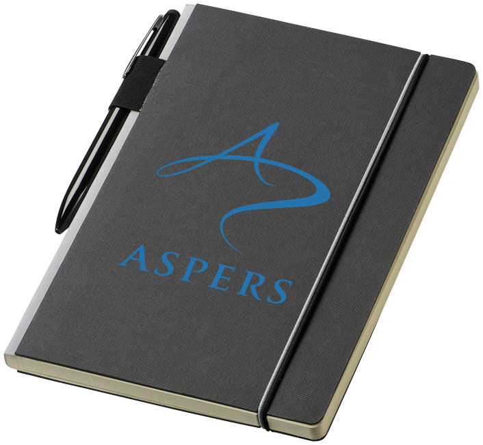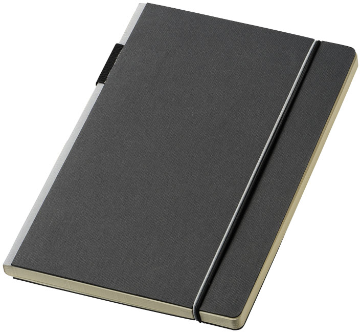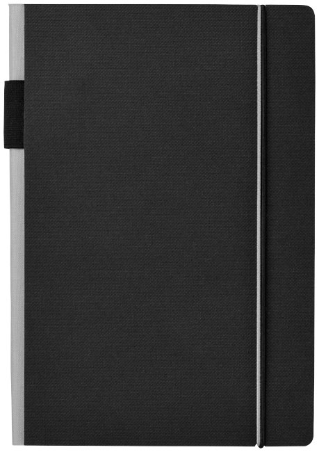 Cuppia notitieboek. Klassiek zwart hardcover A5 notitieboek dat met de gekleurde rug en elastieksluiting net even anders is dan andere. Op de rug een handige elastieklus voor uw pen. Met 80 vel gelinieerd papier (80 g/m²). Geleverd in Journalbooks geschenketui. Karton.