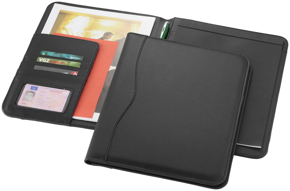 Ebony A4 portefeuille. Portefeuille met pennenlus, documentvakken en notitieblok met 20 pagina's gelinieerd papier. Pen en accessoires niet inbegrepen. Kunstleer.