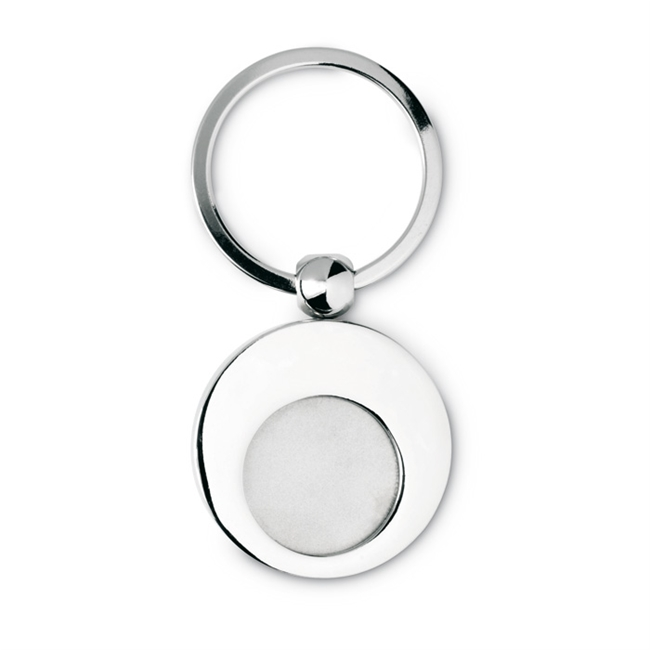 Ronde metalen sleutelhanger met binnenin een winkelwagenmuntje. Ideaal voor de supermarkt.