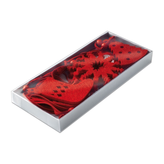 Set van 12 vilten kerstboomhangers in 3 traditionele figuren: kerstsok, sneeuwvlok en kerstboom. Verpakt in een PVC geschenkverpakking met transparante deksel.