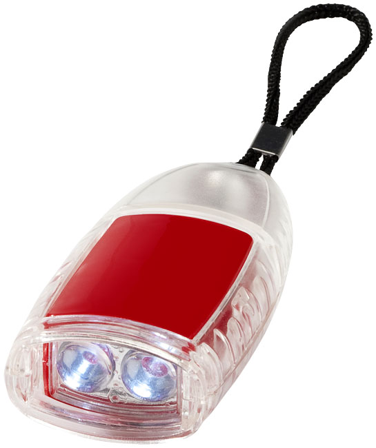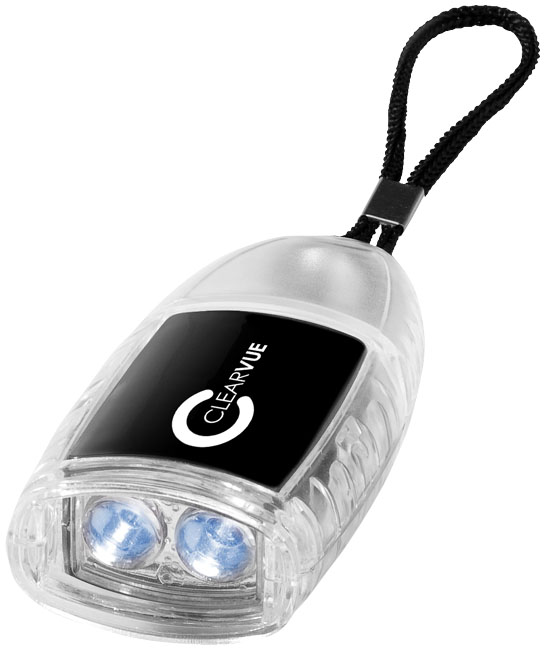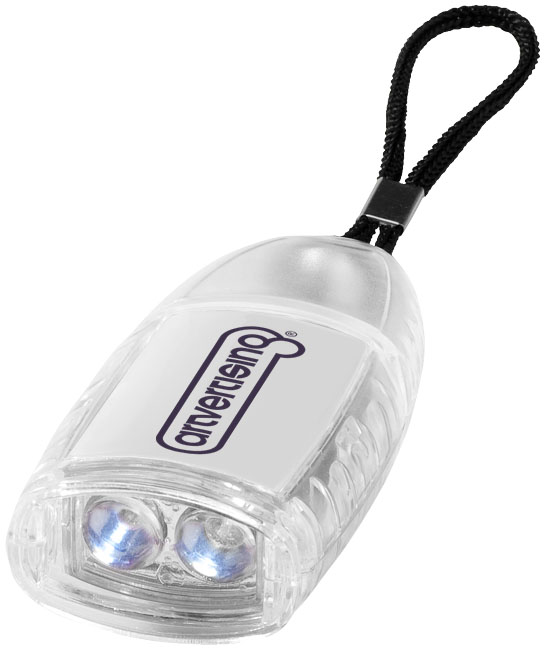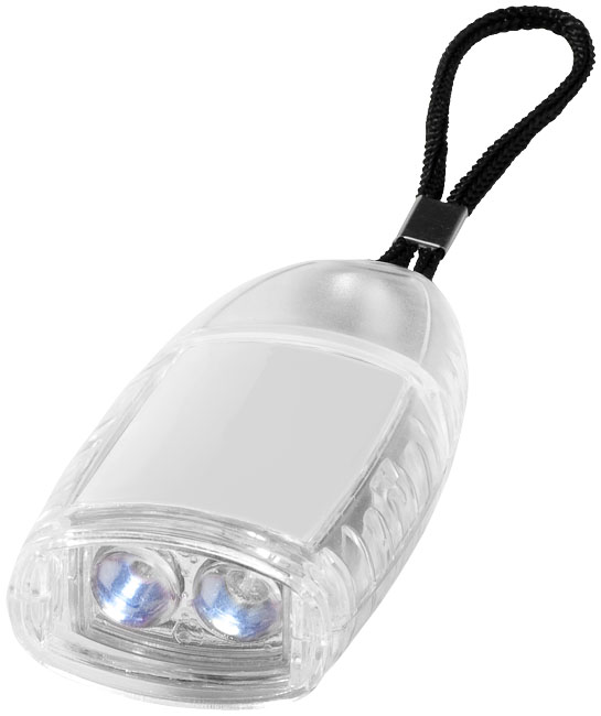 Flipster sleutelhangerlampje. Twee witte LED-lichten. Draaibaar middenstuk. Aan-/uit-schuifknop. Nylon koord. Incl. batterijen. ABS en PP kunststof.