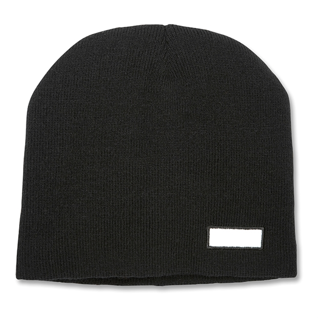 Dubbellaags gebreide beanie van acryl met opgestikt label speciaal voor bedrukking van uw logo.