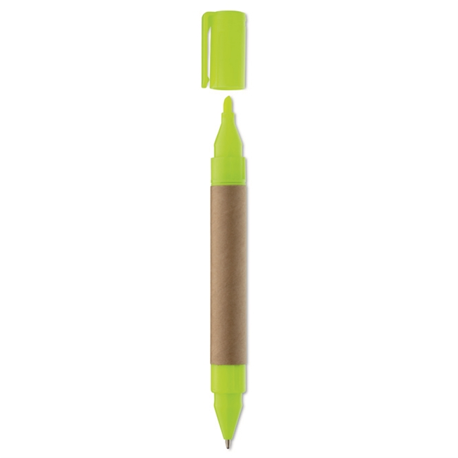 Balpen met papieren huls en markeerstift, draaimechanisme. Blauwe inkt.