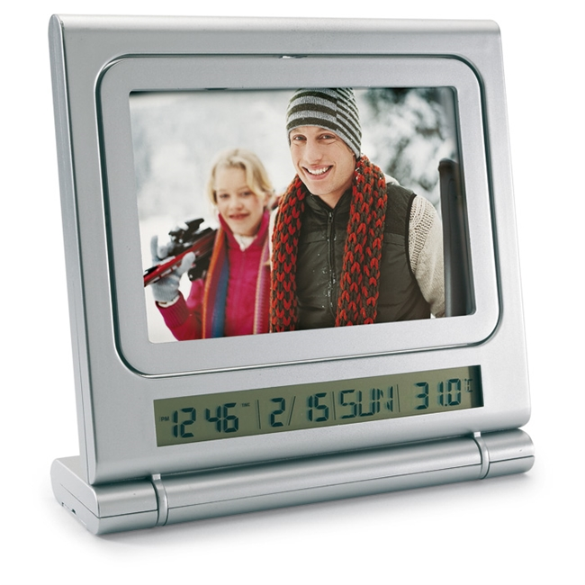 Weerstation met fotolijst en memoboard. Display met tijd, datum, dag en temperatuur. Alarm functie. Inclusief 2 magneten en 2 x LR44 knoopcel batterijen.