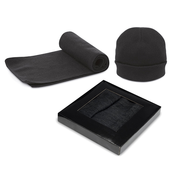 Set van een muts en sjaal van gebreid acryl. Verpakt in een geschenkverpakking.