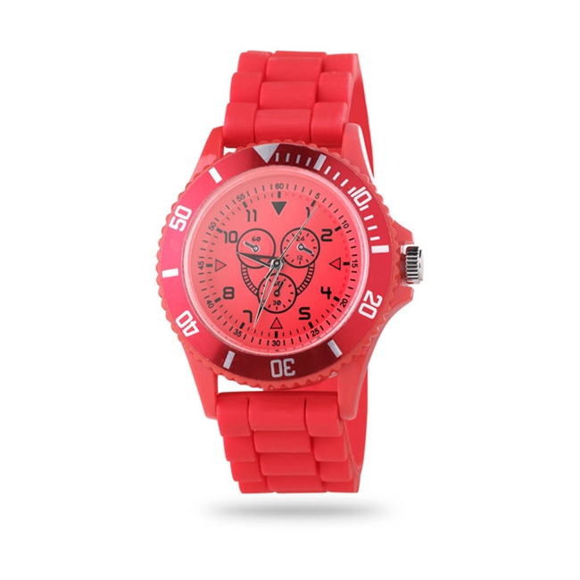 Quartz horloge van ABS met siliconen band en 3 decoratieve metertjes in de wijzerplaat. Geleverd in een kunststof doosje.