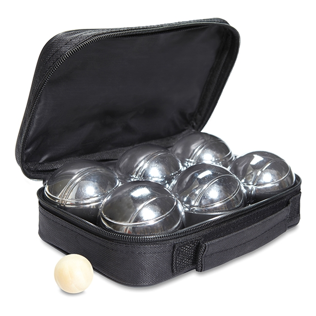 Metalen jeu de boules set in 600D polyester tasje. Doorsnee metalen bal 7,3 cm. Gewicht per bal 730 gram.