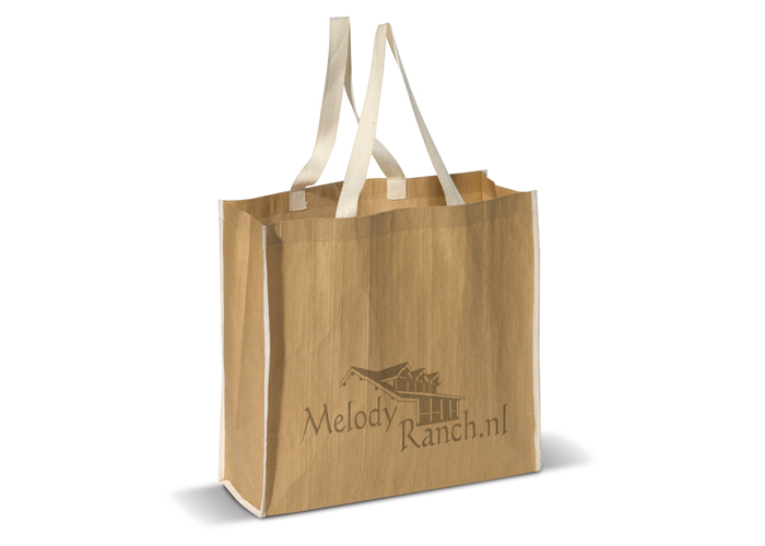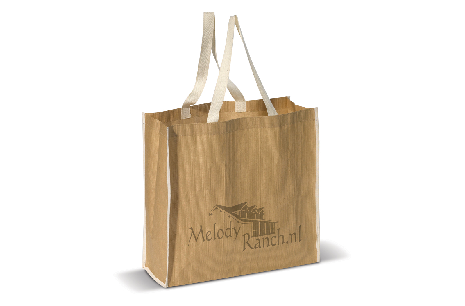 Grote tas gemaakt van stevig papier in combinatie met polyester materiaal, met twee lange hengsels.