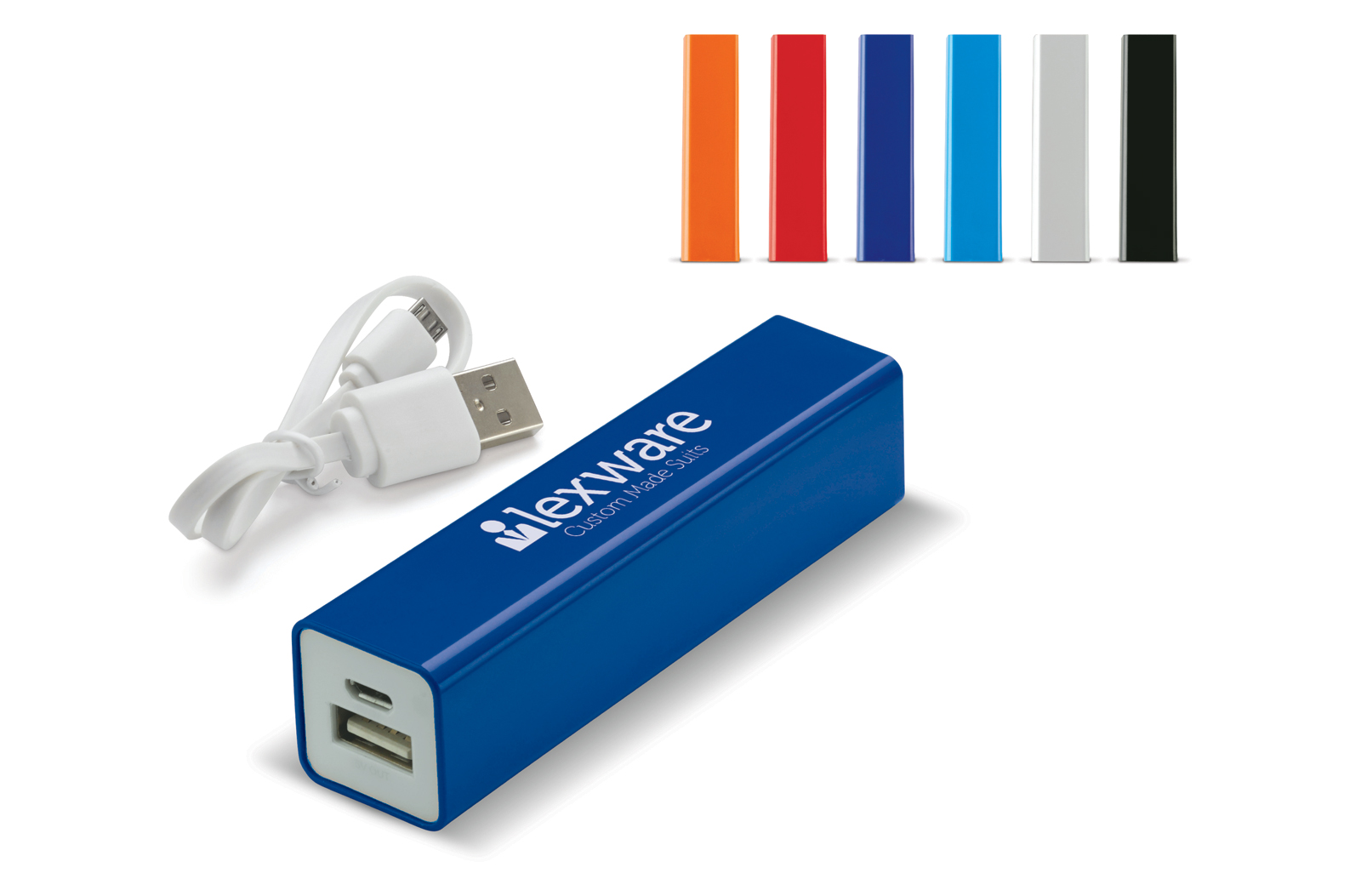 Kunststof 2200mAh powerbank in zeer veel kleuren leverbaar. Wordt geleverd inclusief kabel om de powerbank op te laden. Per stuk in doosje verpakt.