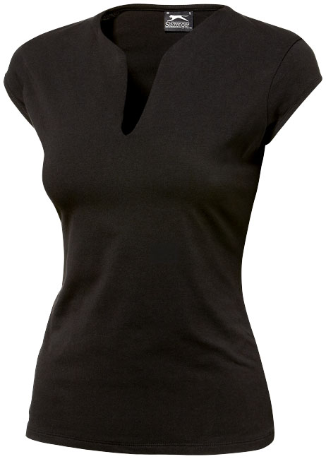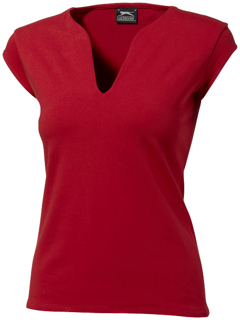 Rally dames T-shirt. Modieuze halsvorm.Zijnaden.Dubbellaags voorzijde.Nektape in dezelfde stof en binding op de mouwen.Tone on tone Slazenger logo op rechterschouder. Single jersey van 95% katoen en 5% elasthaan. Gewicht 170-180g/m².