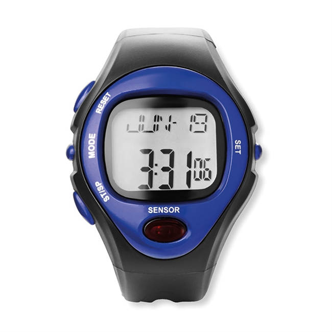 Digitale sporthorloge, datum, alarm, uursignaal, chronograaf, hartslag meter en calorie verbrander.