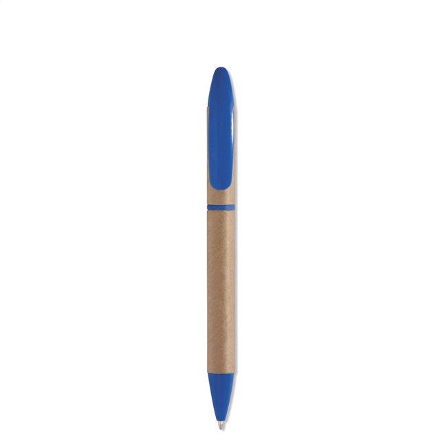 Balpen met draaimechanisme, gemaakt van biologisch afbreekbaar kunststof en gerecycled karton. Blauwe inkt.