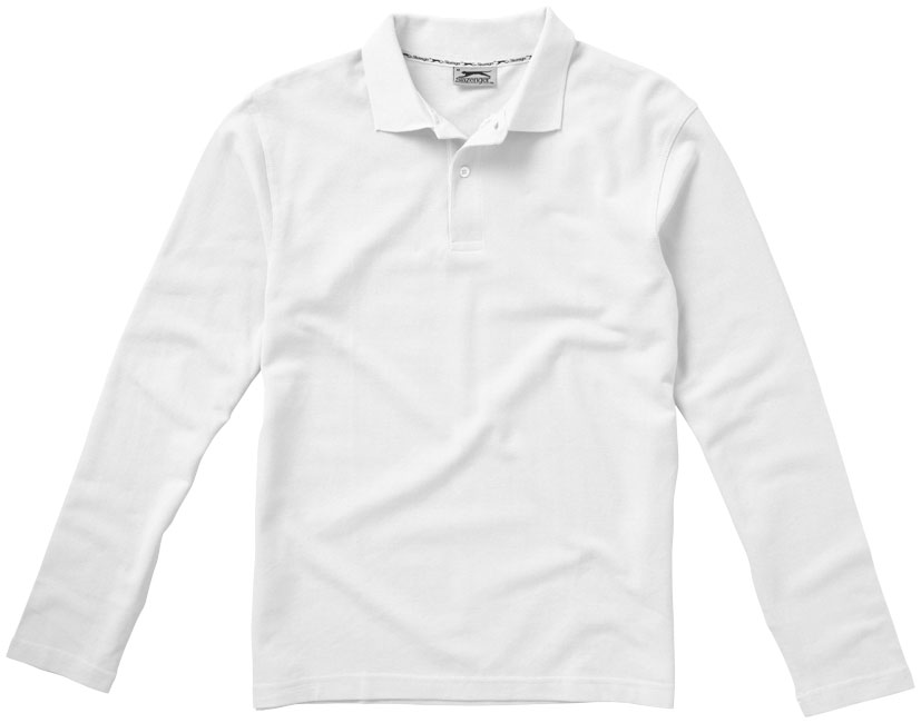 Umpire polo met lange mouw. Polo met lange mouw en 1×1 vlak gebreide rib kraag en manchetten.Knopenlijst met 2 gegraveerde tonale knopen.Bedrukt visgraat nektape .Label in zijnaad. Piqué van 100% gekamd katoen. Weight 200- 220 g/m².