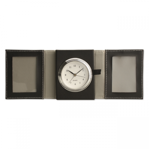Reiswekker met twee fotovakjes aan de zijkanten, in een zwart PU hoesje. Formaat foto 4.5 x 6.5 cm.